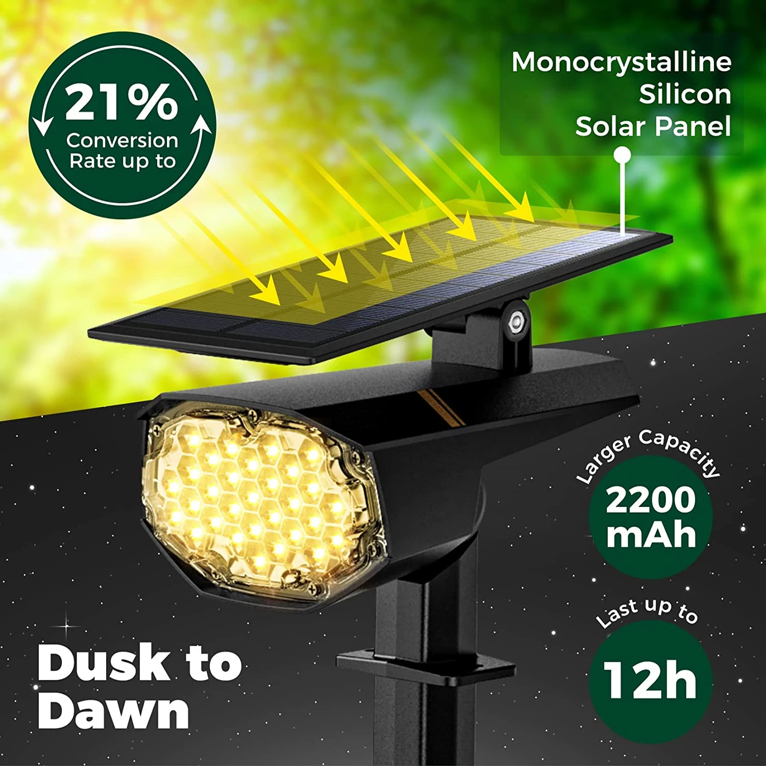 - 【IP68 Waterproof & Durable】 The solar landscape spotlight adopts IP68 waterproof technology, which is the highest waterproof level of solar light in the market. Ready for extremely terrible weather, waterproof, heat-resistant and frost resistant.