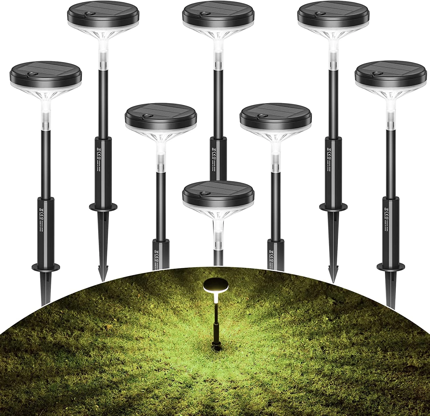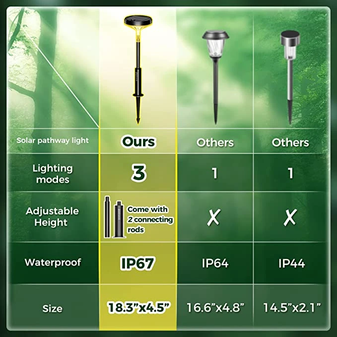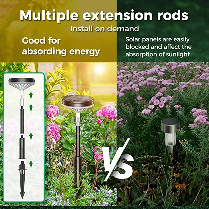 Adjustable Height & Easy installation¡¿Every solar pathway light outdoor comes with 2 connecting rods, which can be used to extend the height of light. The maximum height can reach up to 18.31 inch. Simply connect the solar light head with rod and ground spike. Then inserted into the ground with sufficient sunshine. The solar powered pathway lights would auto on at night and auto off at sunrise.