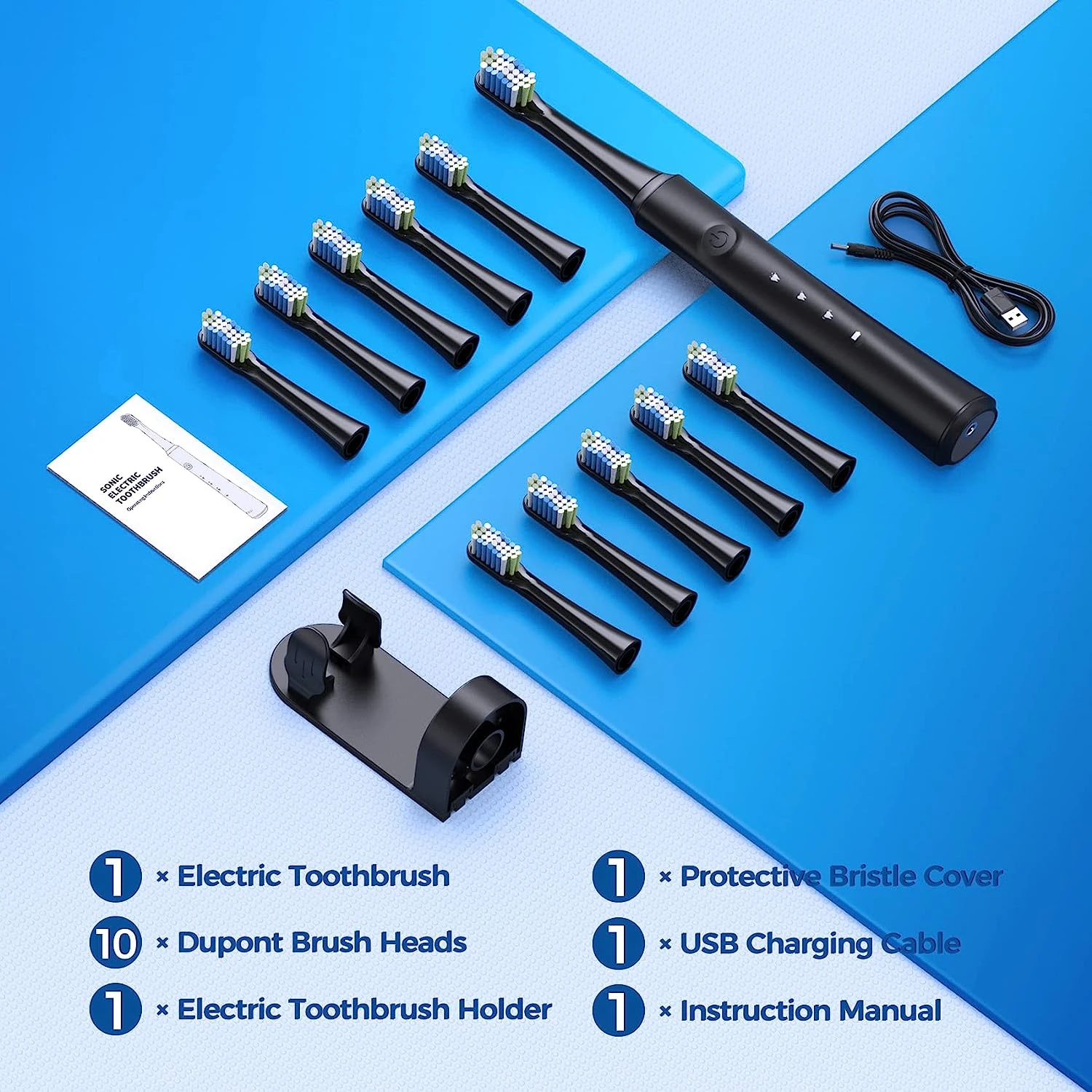 - 【PACKAGE】 – Electric toothbrush for adults & kids x1, DuPont electric toothbrush heads x10, User manual x1 , USB charging cable x1. Ideal GIFT CHOICE for family& friends.