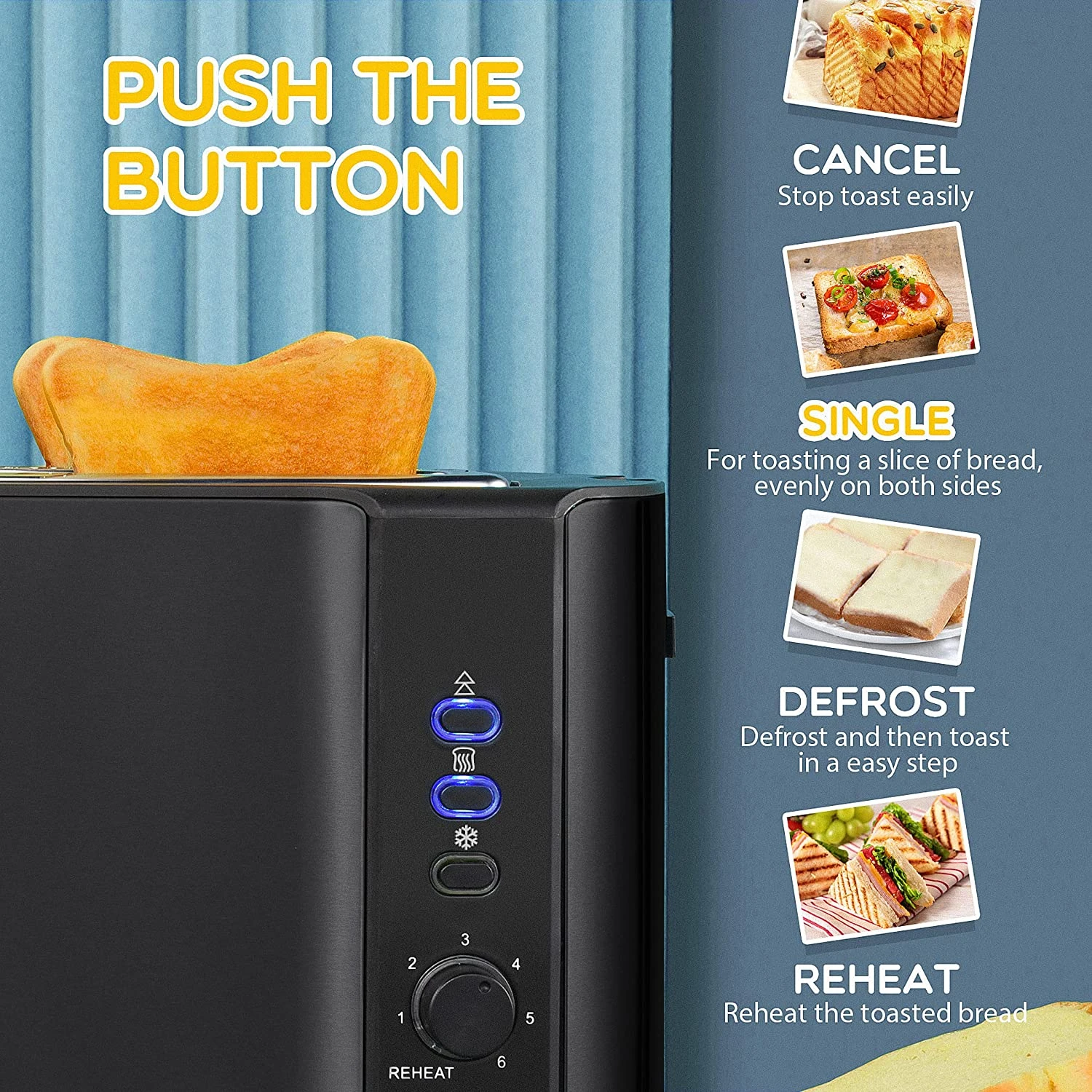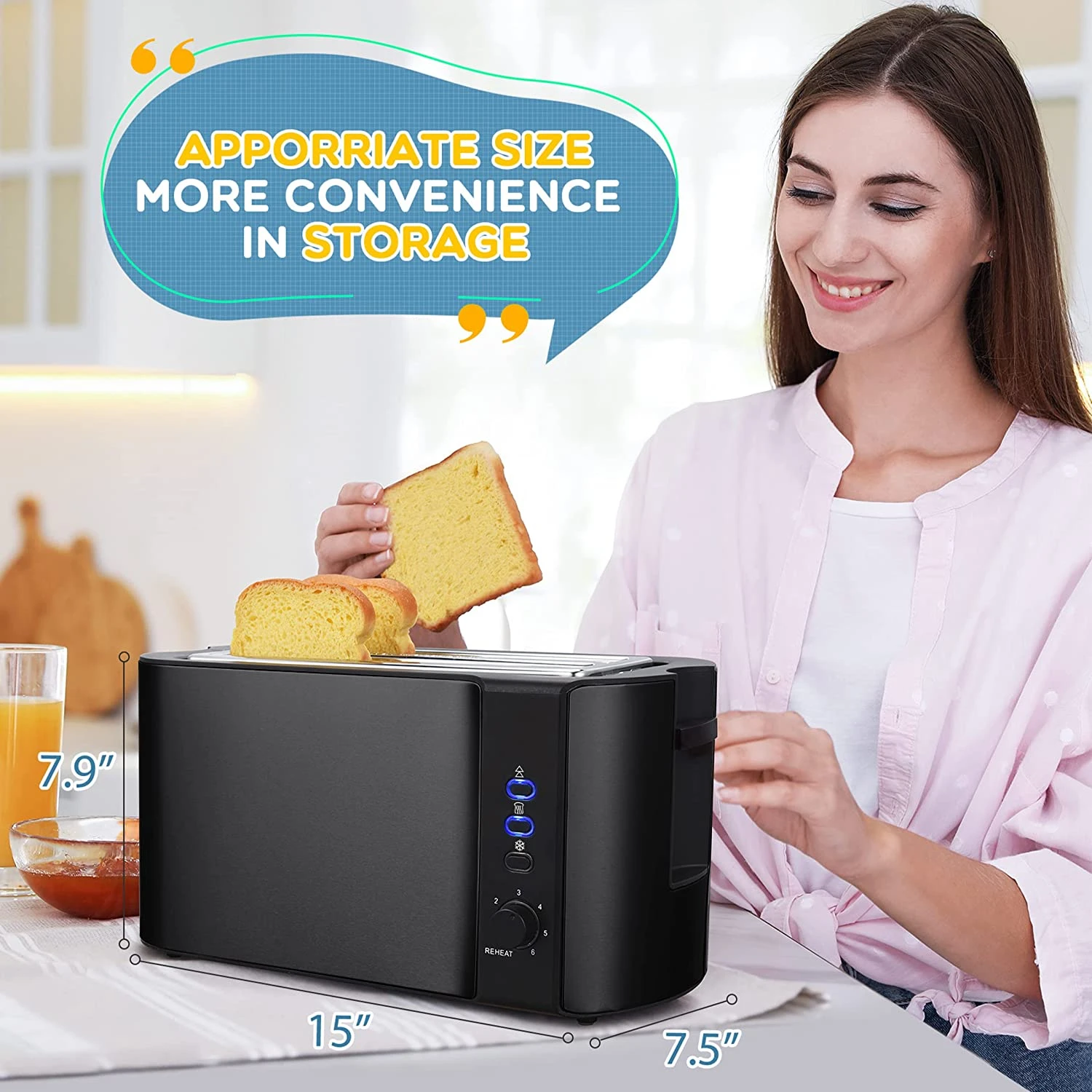 - 6 SHADE SETTING TO MEET DIFFERENT TASTES – The long slot toaster is equipped with 6-setting accurate toasting settings, so you can customize your toast according to your taste preference. The stainless steel toaster 4 slice feature Cancel, Defrost, and Reheat 3 control function. Say goodbye to embarrassing burnt or cold toast!