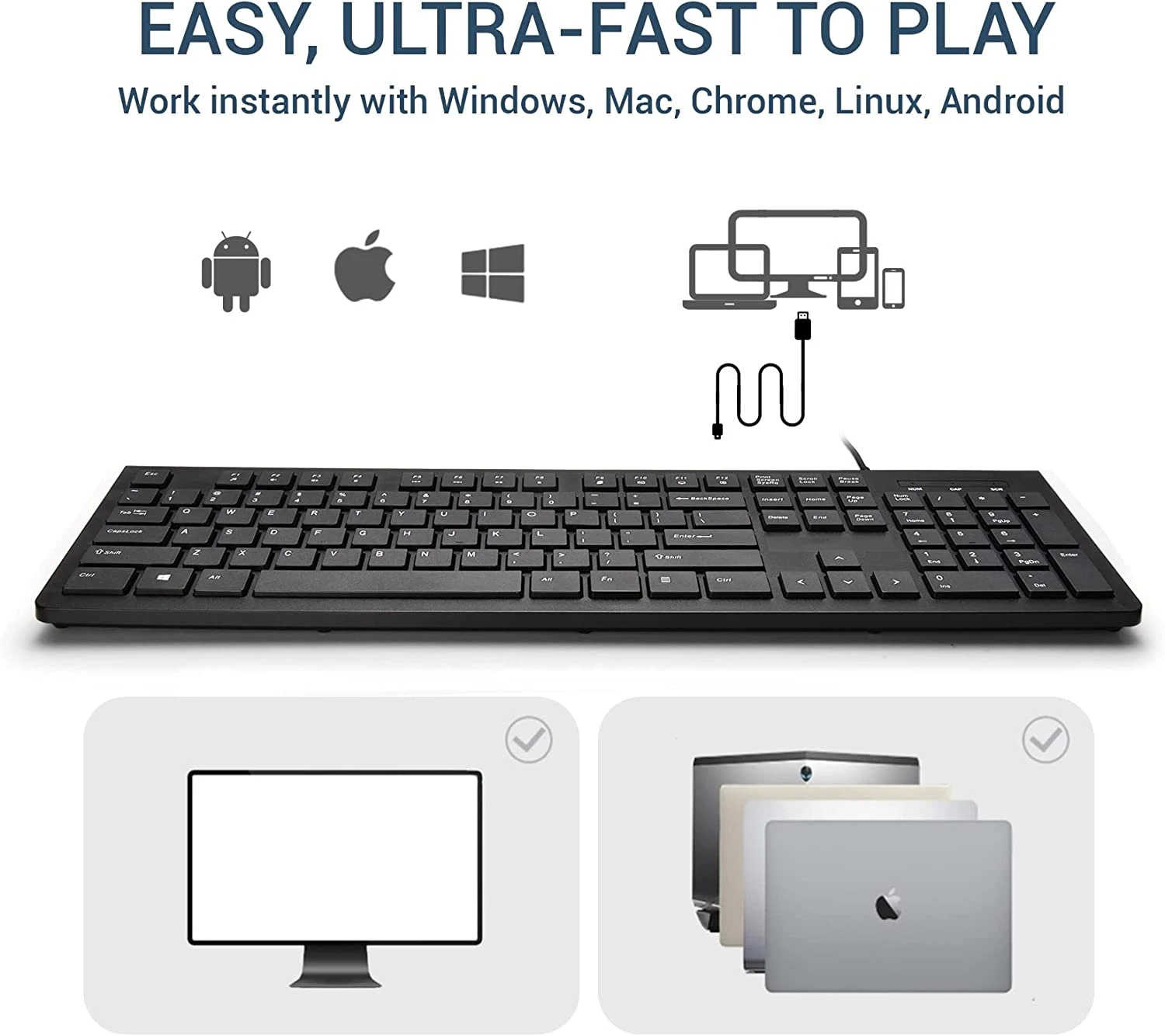 - 【Easy, Ultra-Fast to Play】CL206 wired computer keyboard is super easy to use, it works instantly with any USB devices, no driver needed, no need to worry about interference that breaks your connection, no charging or battery consumption.