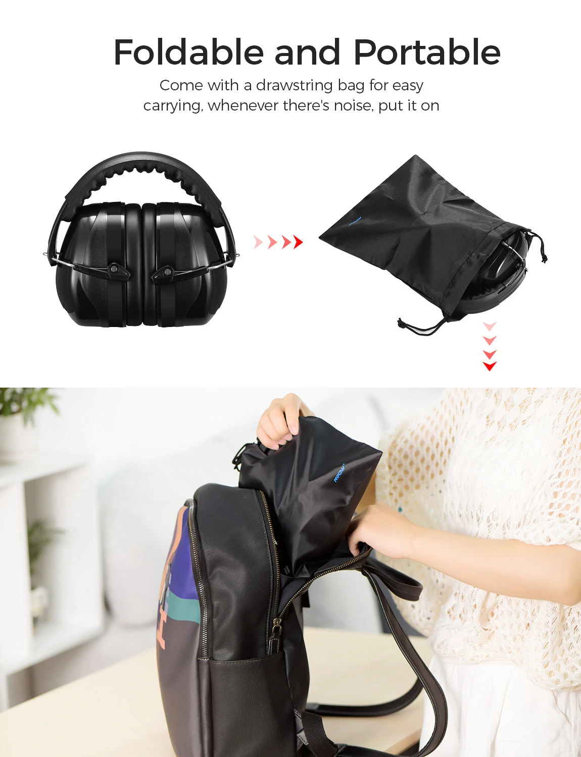 COMPACT AND PORTABLE: Our lightweight ear muffs feature a foldable style as the ear cups collapse into the headband. Travel drawstring bag included for ease of packing them or to neatly store away, dust-free.