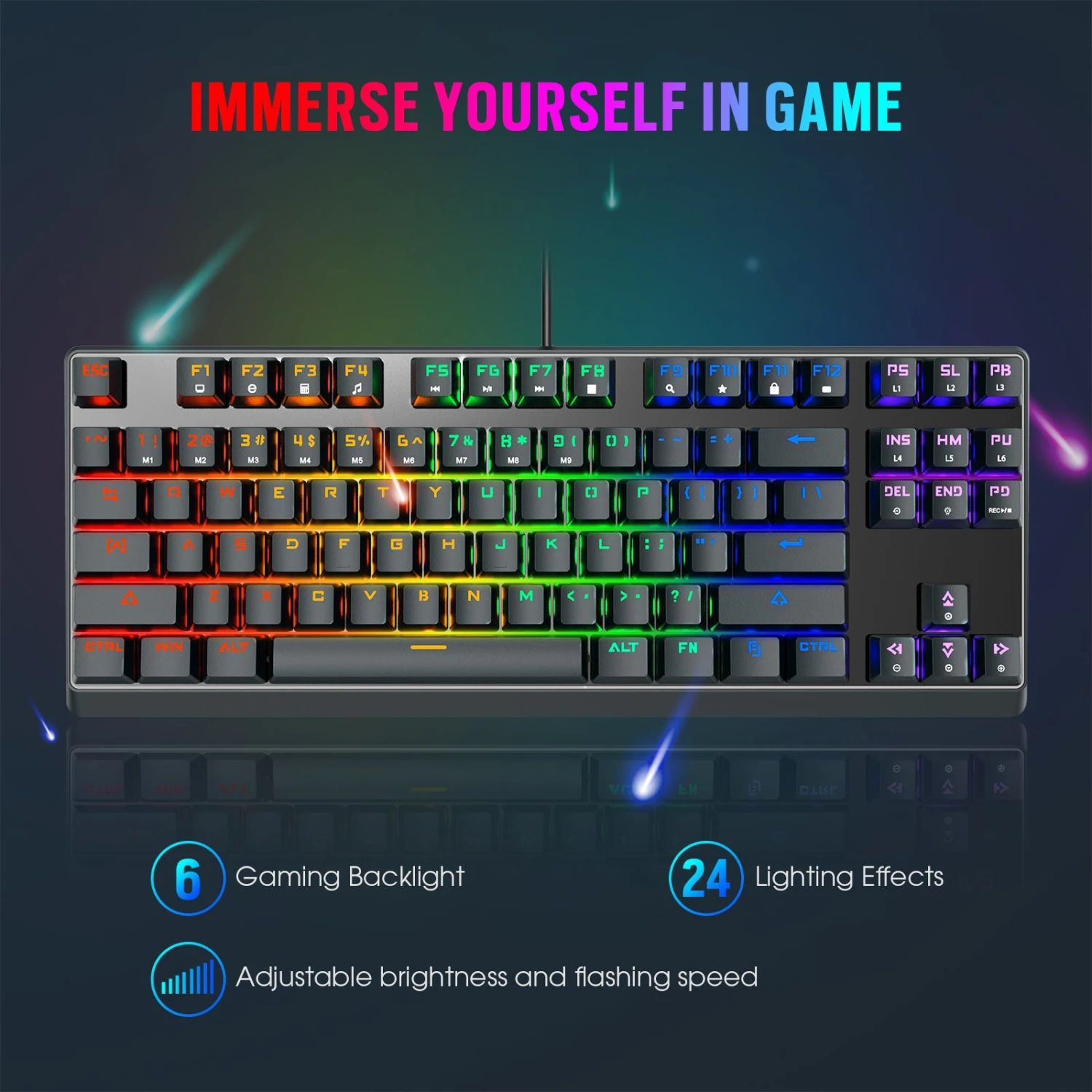 Enhanced Backlit Gaming Keyboard: This mechanical keyboard has 6 special gaming backlights (ACT/RTS/FPS/SPG/MOBA/RAC), 24 customized backlight effects, 5 adjustable brightness and 5-level speed. Help create an immersive atmosphere and bring you into a virtual game world rather than in a dull room.