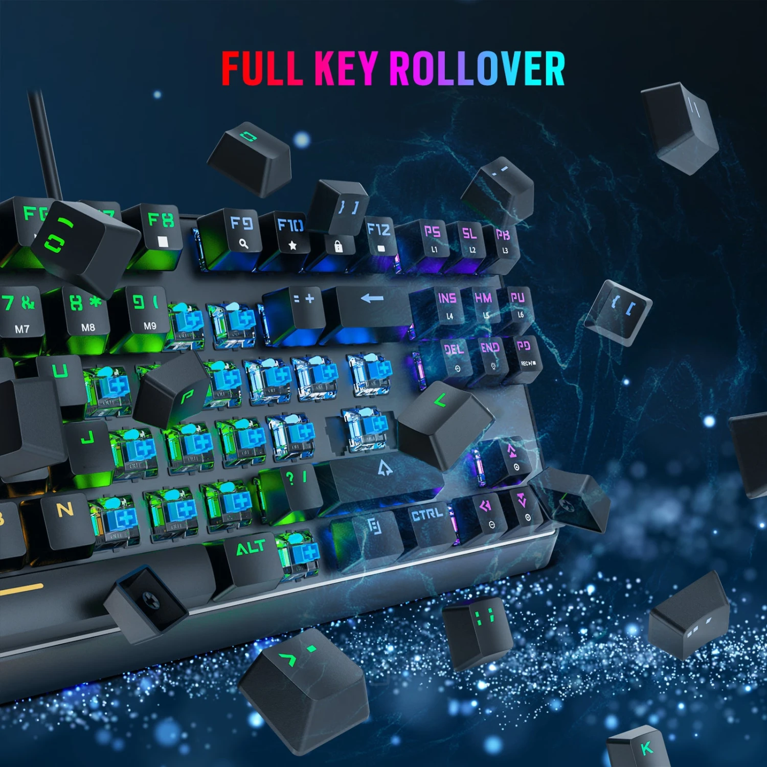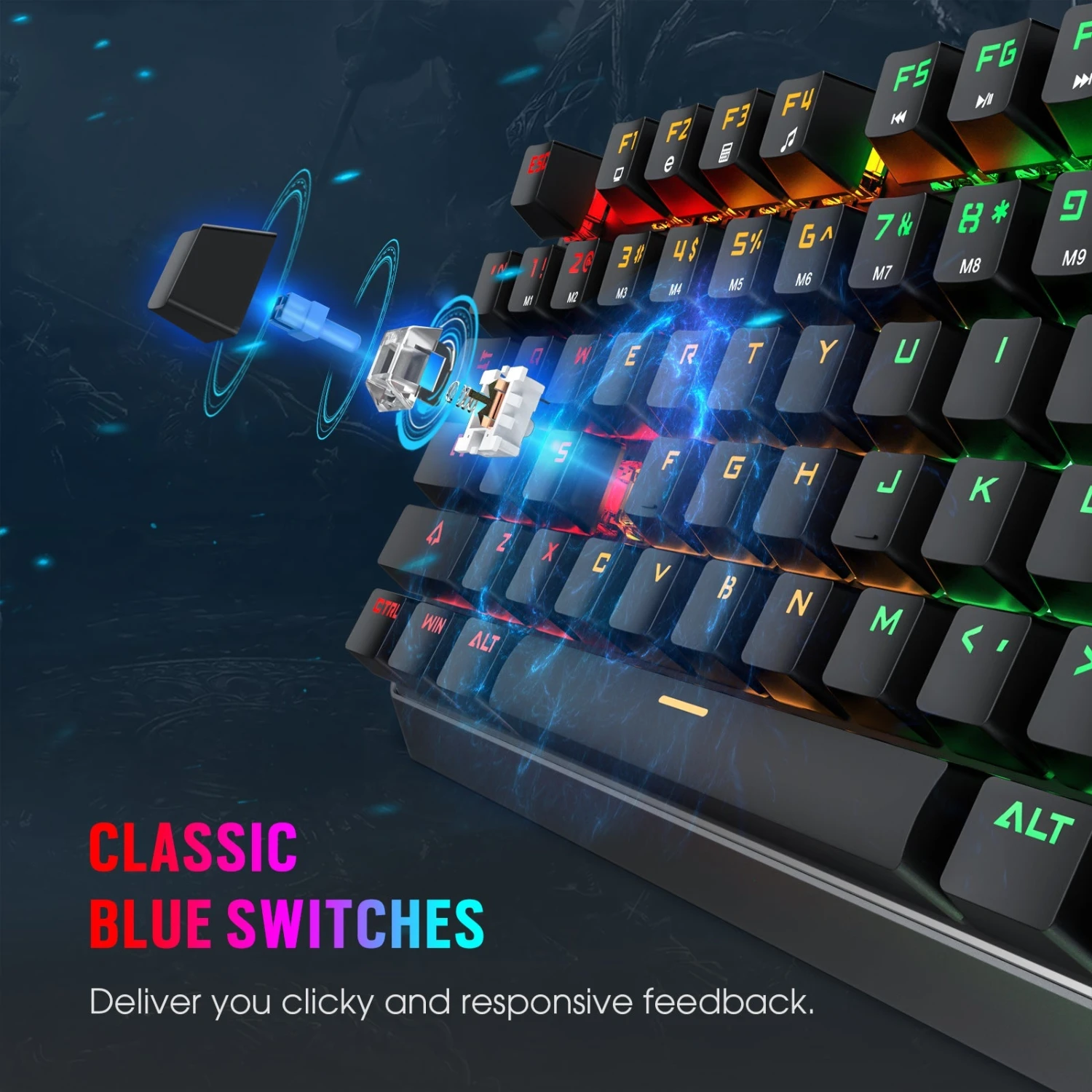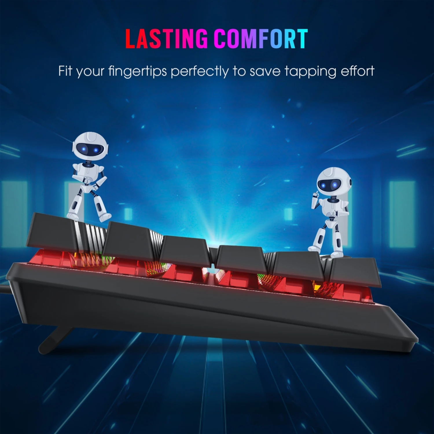 Tactile & Clicky Blue Switch: wired mechanical keyboard is equipped with clicky blue switches, which has tactile feedback, less operation force and faster speed. A best gaming keyboard for gamer to enjoy a clear and satisfying clicksound. The floating keycaps are ergonomically curved, reducing your fatigue for long-term gaming.