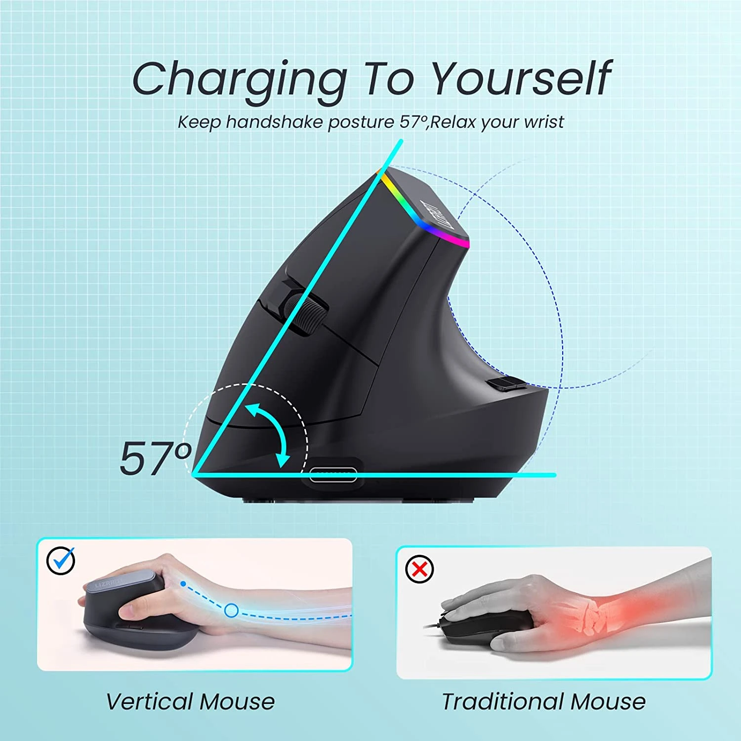 Vertical mouse lift your hand up in a natural handshake position,57° will less your hand pressure utmost and the ergonomic designed fit the contour of your palm for maximum comfort.Get rid of the fatigue from traditional mouse.