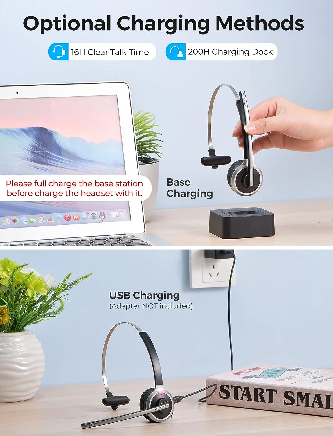 - ๐๐๐น๐น ๐๐ฎ๐ ๐๐ฎ๐๐๐ฒ๐ฟ๐: The wireless office headset with microphone for PC is engineered to keep up with your busy workday, delivering up to 16 hours of talk time on a single charge. The wireless headset comes with a charging base that doubles as a stand and keeps your desktop clutter-free. The rechargeable base provides up to 200 hours of additional working time when fully charged.