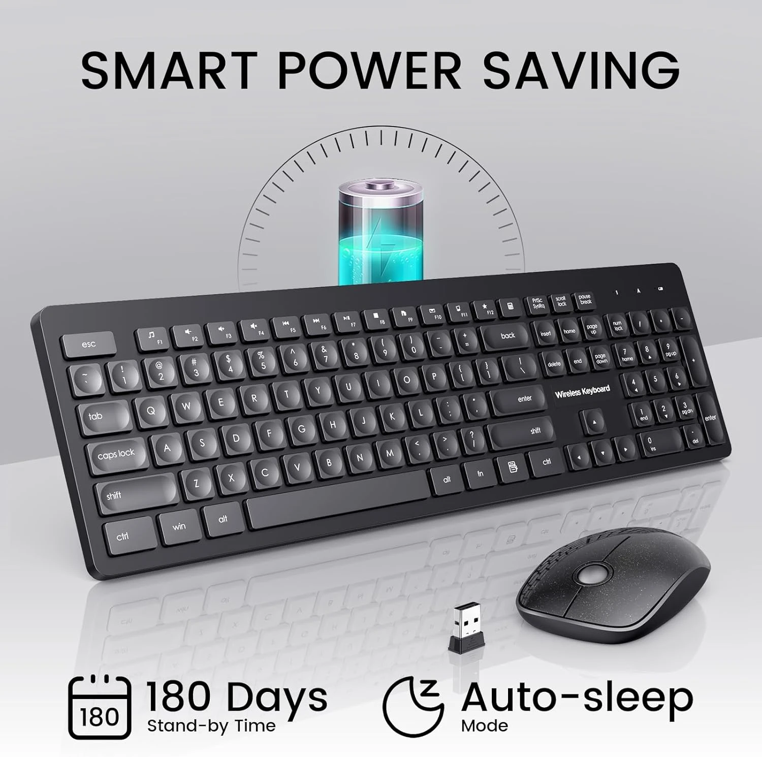 - Long-lasting Battery Life- Tired of short battery life? This keyboard and mouse wireless boasts long-lasting battery run time. With 2 alkaline batteries (1 AA battery for mouse, 1 AAA battery for keyboard. Batteries not included), the keyboard will last for up to 15 months, and mouse for up to 24 months!